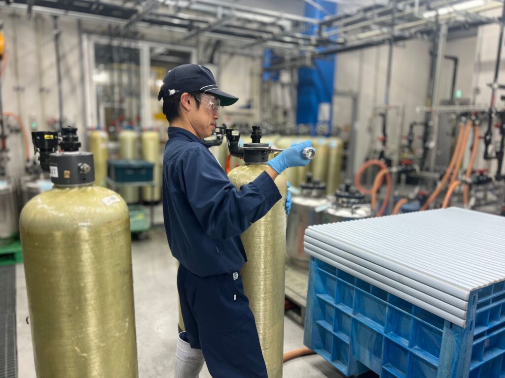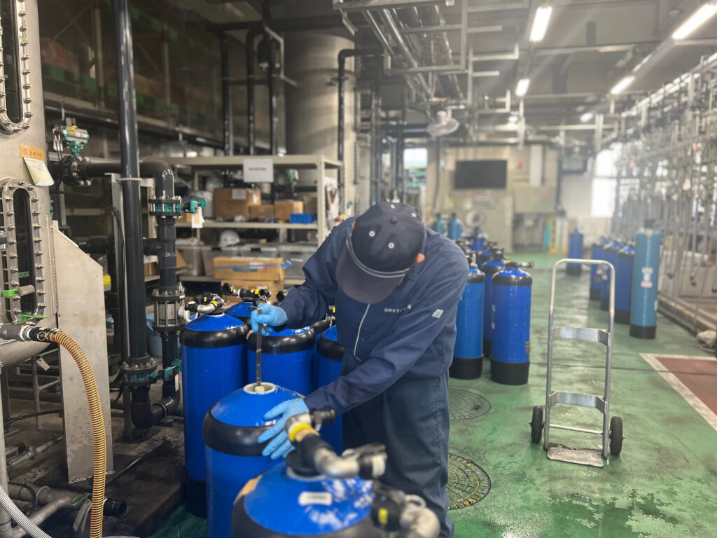 水は、さまざまな処理工程を経て、超純水へと精製されていきます。当社では、事業所水処理設備の運転管理およびパッケージ化した規格型商品(水処理装置)、レンタル式水処理装置の性能確認業務に携わっております。