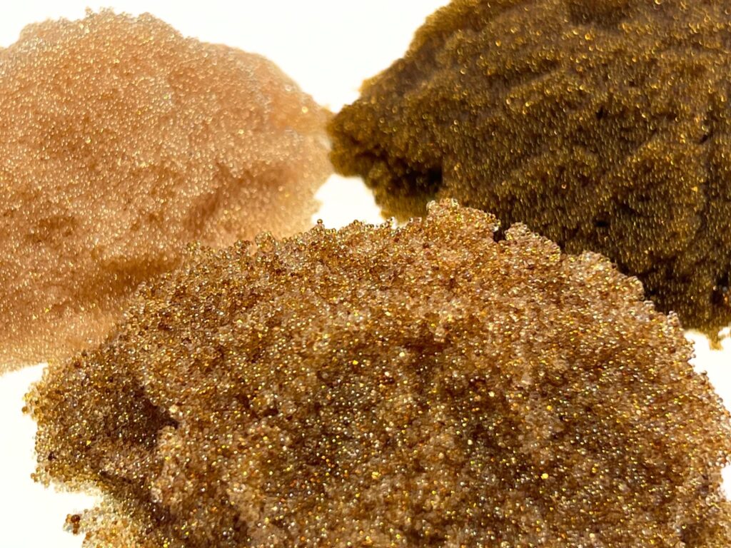イオン交換樹脂は、水中に存在する各種プラス・マイナスイオンを、それぞれのイオン交換樹脂が保持している水素イオン(H⁺)および水酸化物イオン(OH⁻)と交換し、放出することで水分子(H₂O)を生成します。当社では、イオン交換樹脂の精製・再生・混合・個別梱包に加え、イオン交換樹脂を充填したカートリッジ式純水器の整備業務に携わっております。